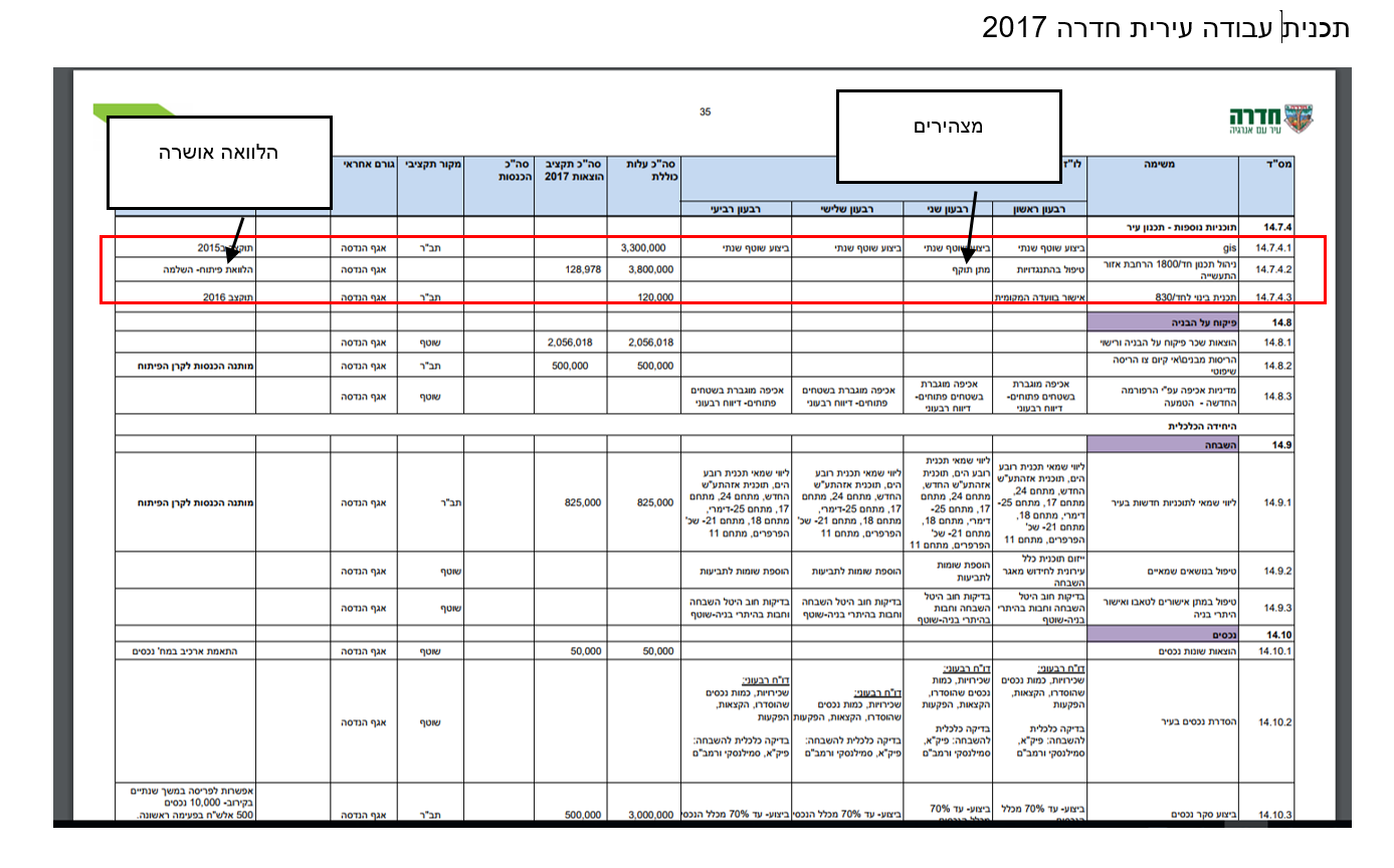 לשימושך תוכניות העבודה של עירית חדרה, בודדנו את העמוד הרלוונטי בתכנית העבודה לשנת 2016 וכן לשנת 2017.